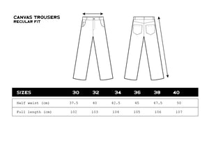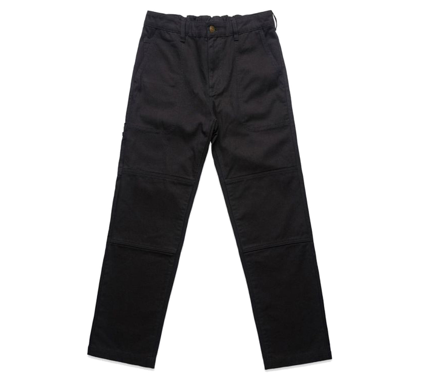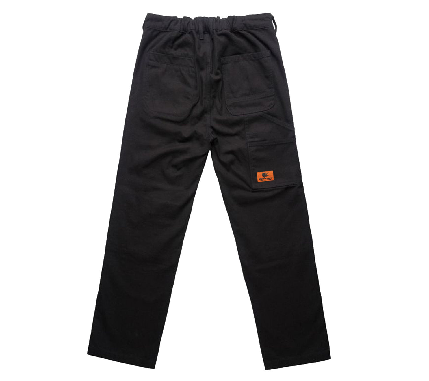 Made from high quality black heavy weight 365 GSM 100% cotton duck canvas. 2 side pockets, 2 back pockets, dual pockets at back RHS, coin pocket, belt loops on waist, button closure, gun metal YKK hardware, elastic panel at back waistband, double knees, preshrunk to minimise shrinkage. These are a high quality item designed and built to last.